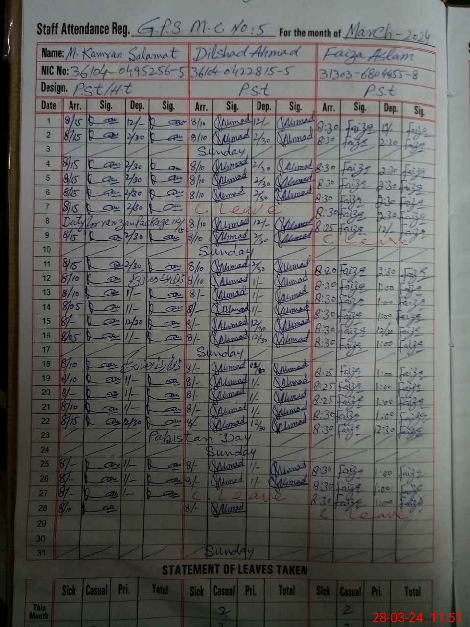 | CNIC | Full Name | Designation | R/C | Absence During Last Calender Month |