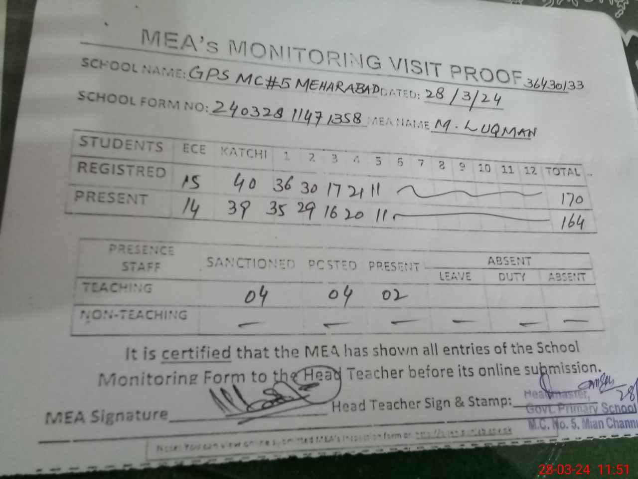 | Attendance Register | Head Teacher | MEA with School | Visit Proof |