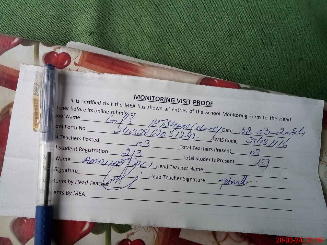 | Attendance Register | Head Teacher | MEA with School | Visit Proof |