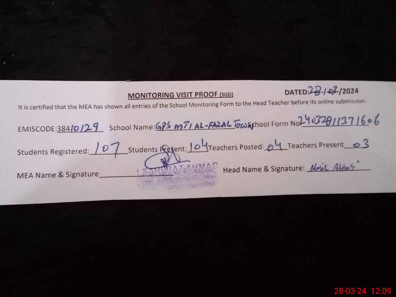 | Attendance Register | Head Teacher | MEA with School | Visit Proof |