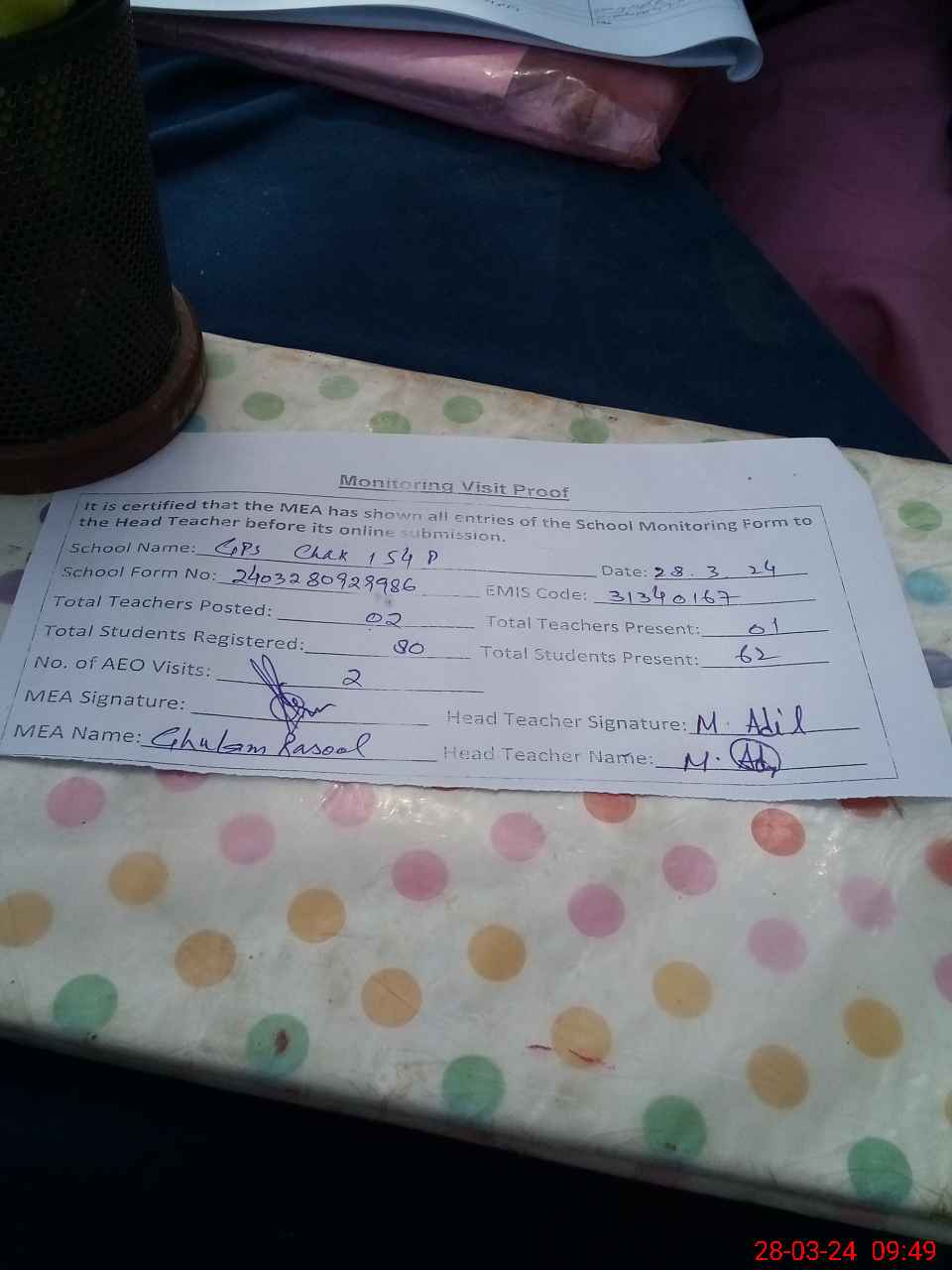 | Attendance Register | Head Teacher | MEA with School | Visit Proof |