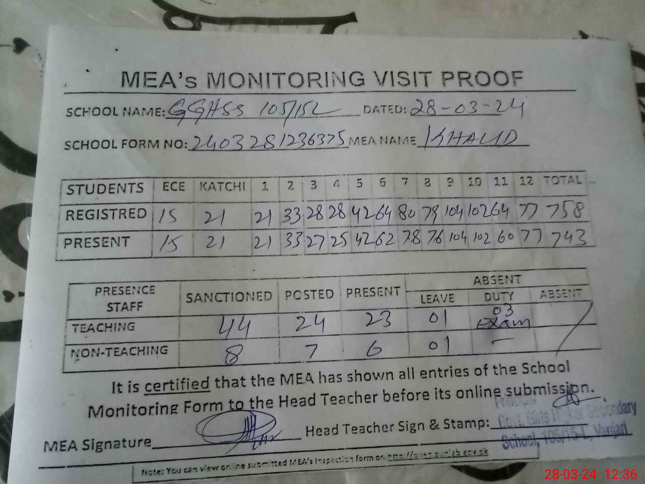 | Attendance Register | Head Teacher | MEA with School | Visit Proof |