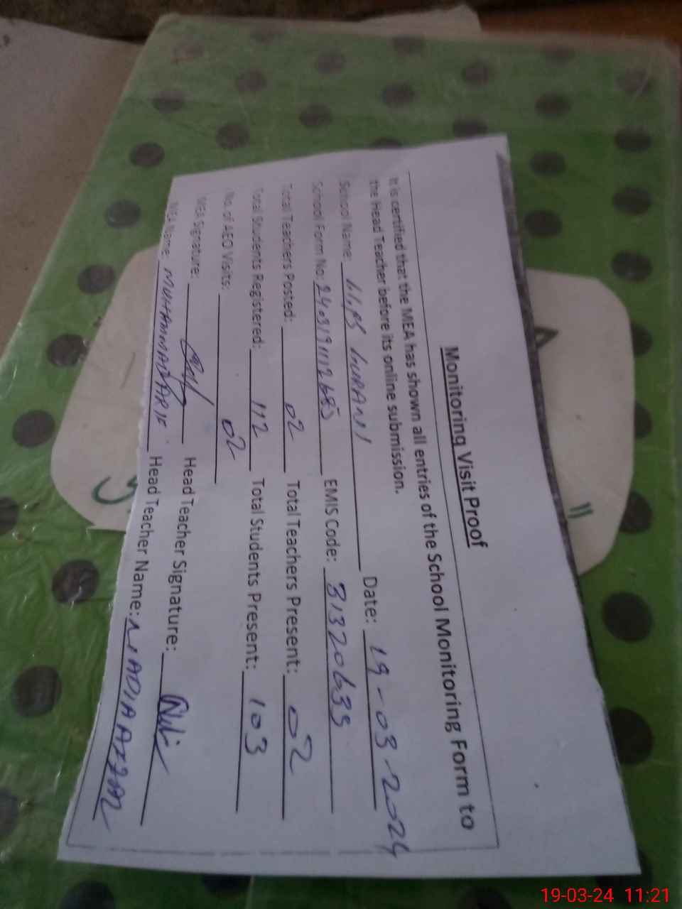 | Certified that this School was Inspected by the Undersigned MEA/DMO Today and the Information Stated Above is as Per Record. | |||||