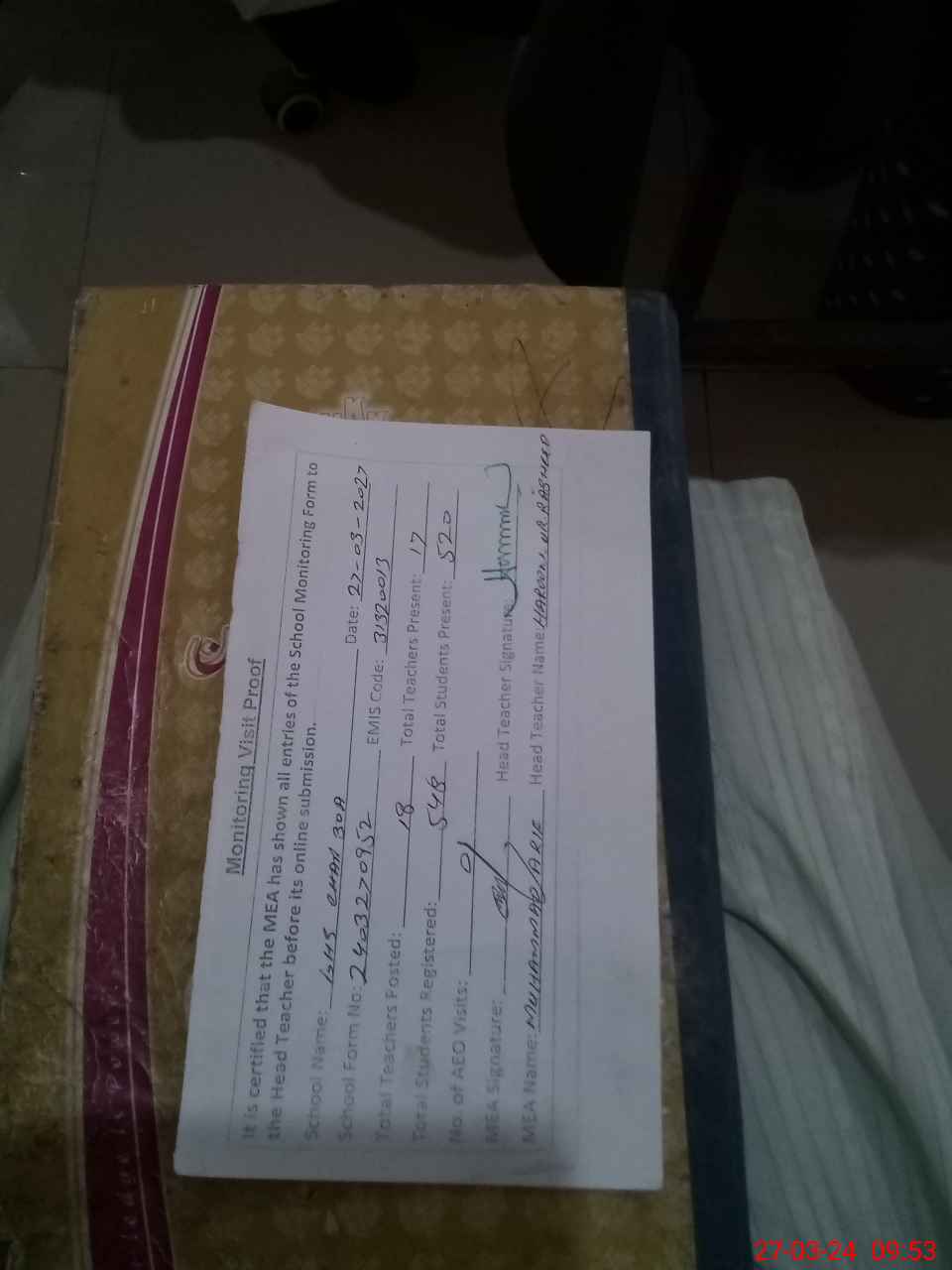 | Attendance Register | Head Teacher | MEA with School | Visit Proof |