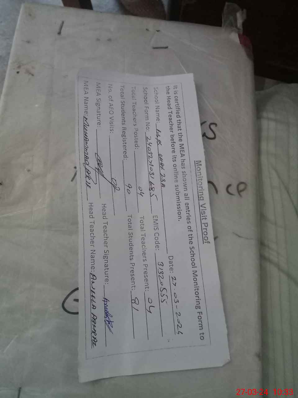 | Attendance Register | Head Teacher | MEA with School | Visit Proof |