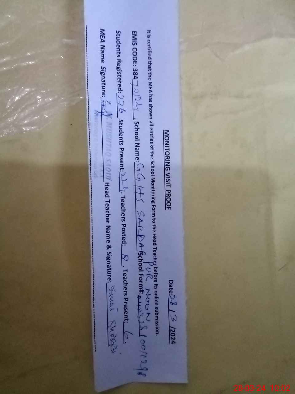 | EMIS Code: 38470124 | Name of School: GGHS SARDAR PUR NOON | |||