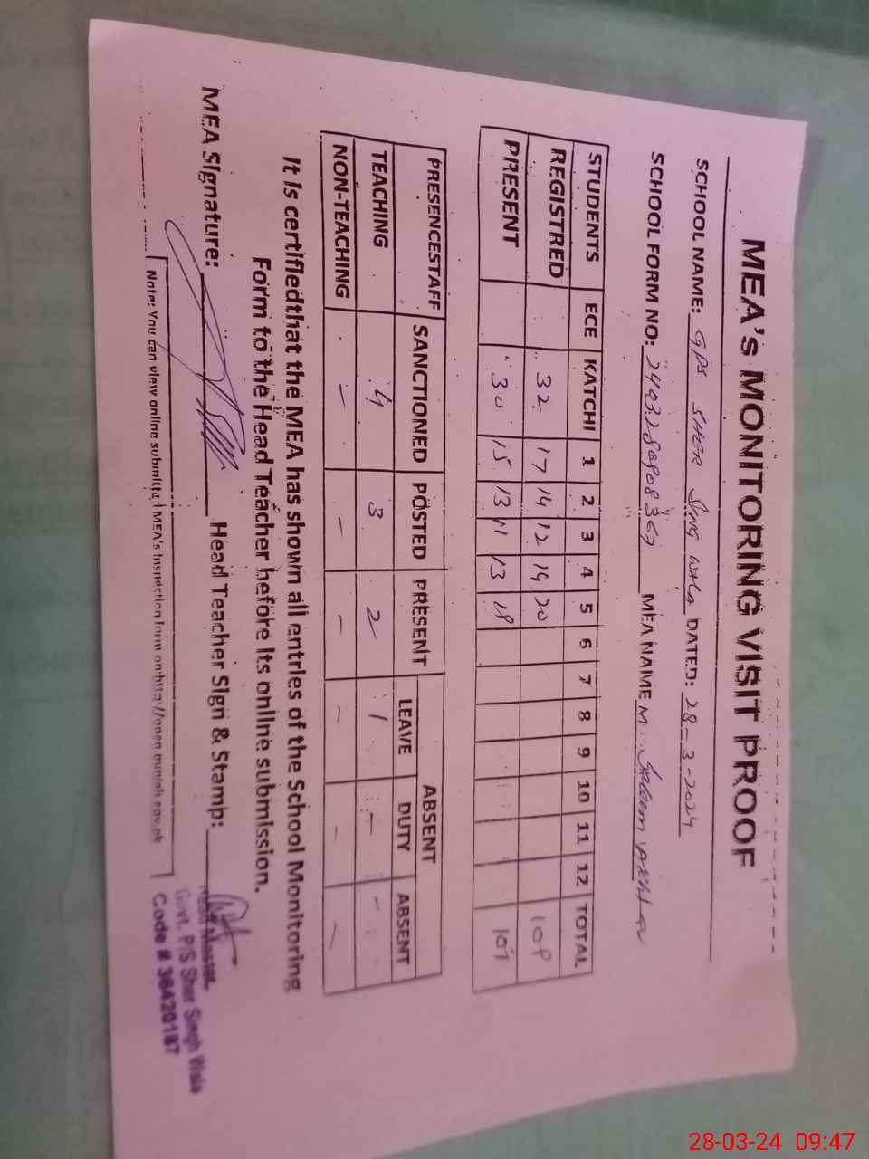 | Attendance Register | Head Teacher | MEA with School | Visit Proof |