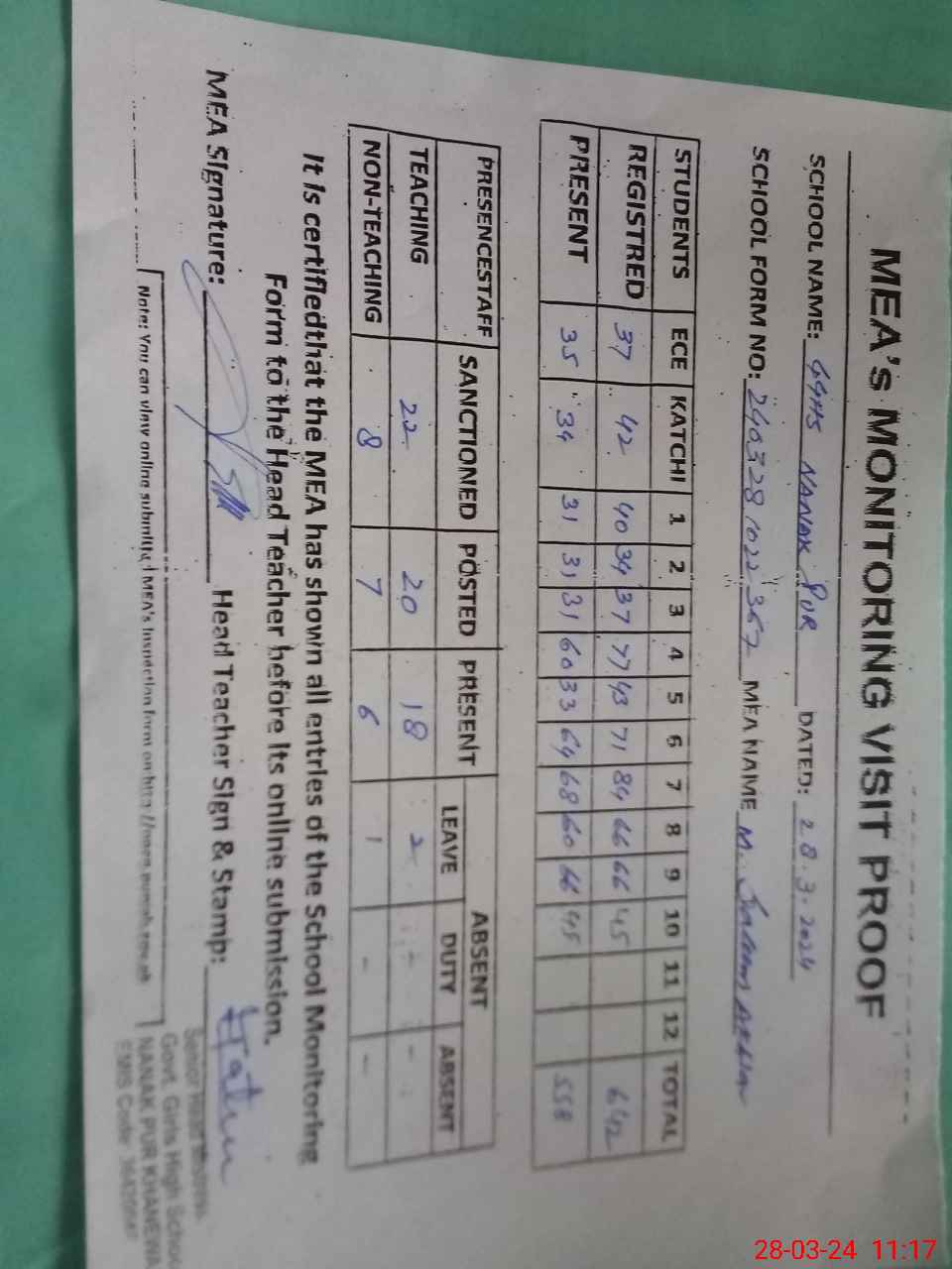 | Attendance Register | Head Teacher | MEA with School | Visit Proof |