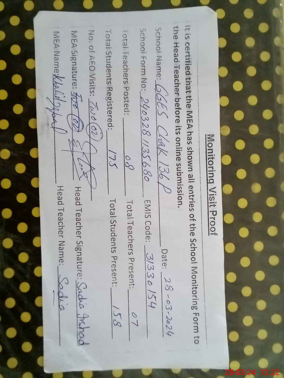 | Attendance Register | Head Teacher | MEA with School | Visit Proof |