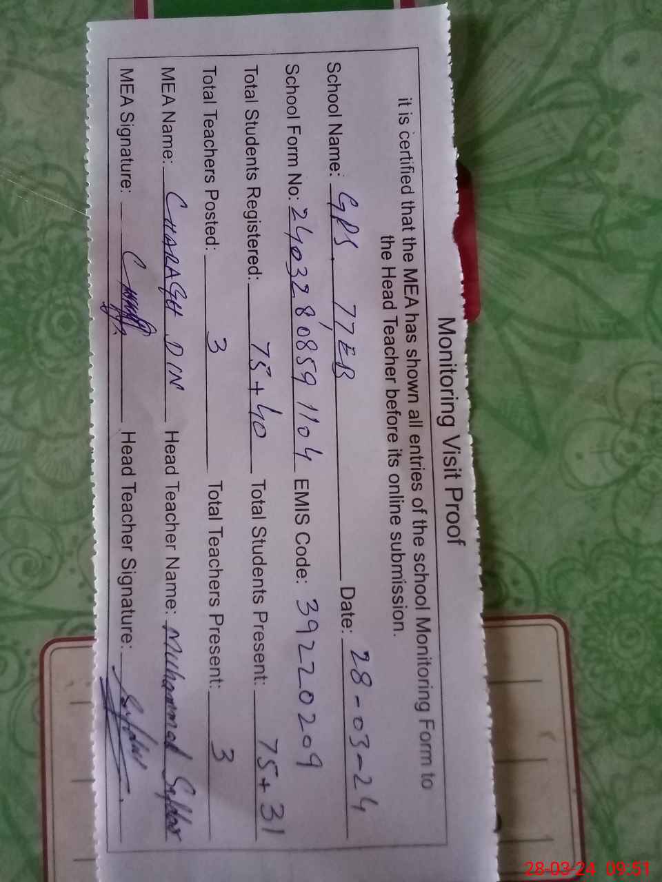 | Attendance Register | Head Teacher | MEA with School | Visit Proof |