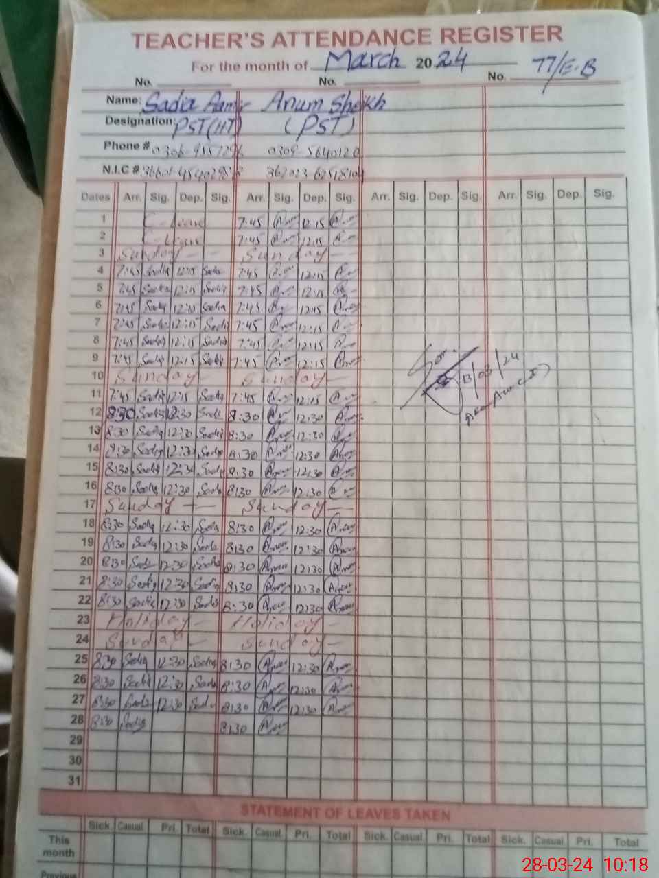 | Name: SA**** AA**** Designation: (School Headmaster's/Headmistress's) PST Phone/Cell Number: 03**** |