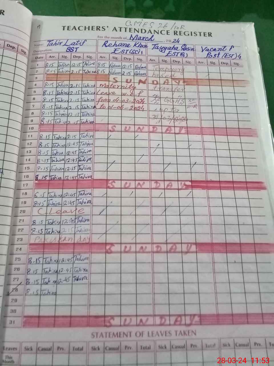 | CNIC | Full Name | Designation | R/C | Absence During Last Calender Month |