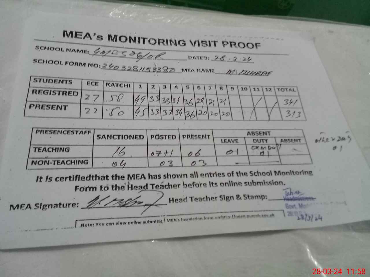 | Attendance Register | Head Teacher | MEA with School | Visit Proof |