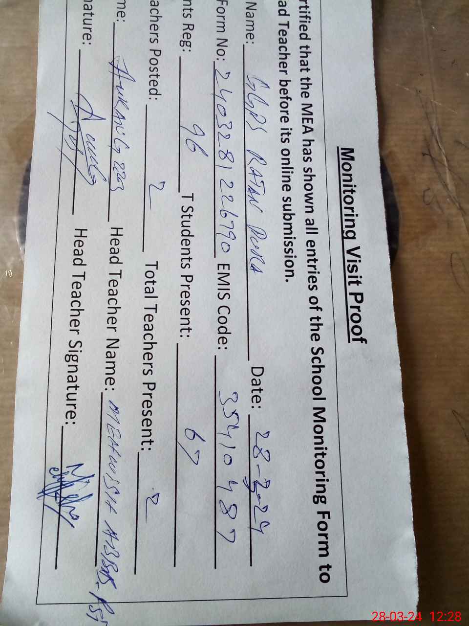 | Attendance Register | Head Teacher | MEA with School | Visit Proof |