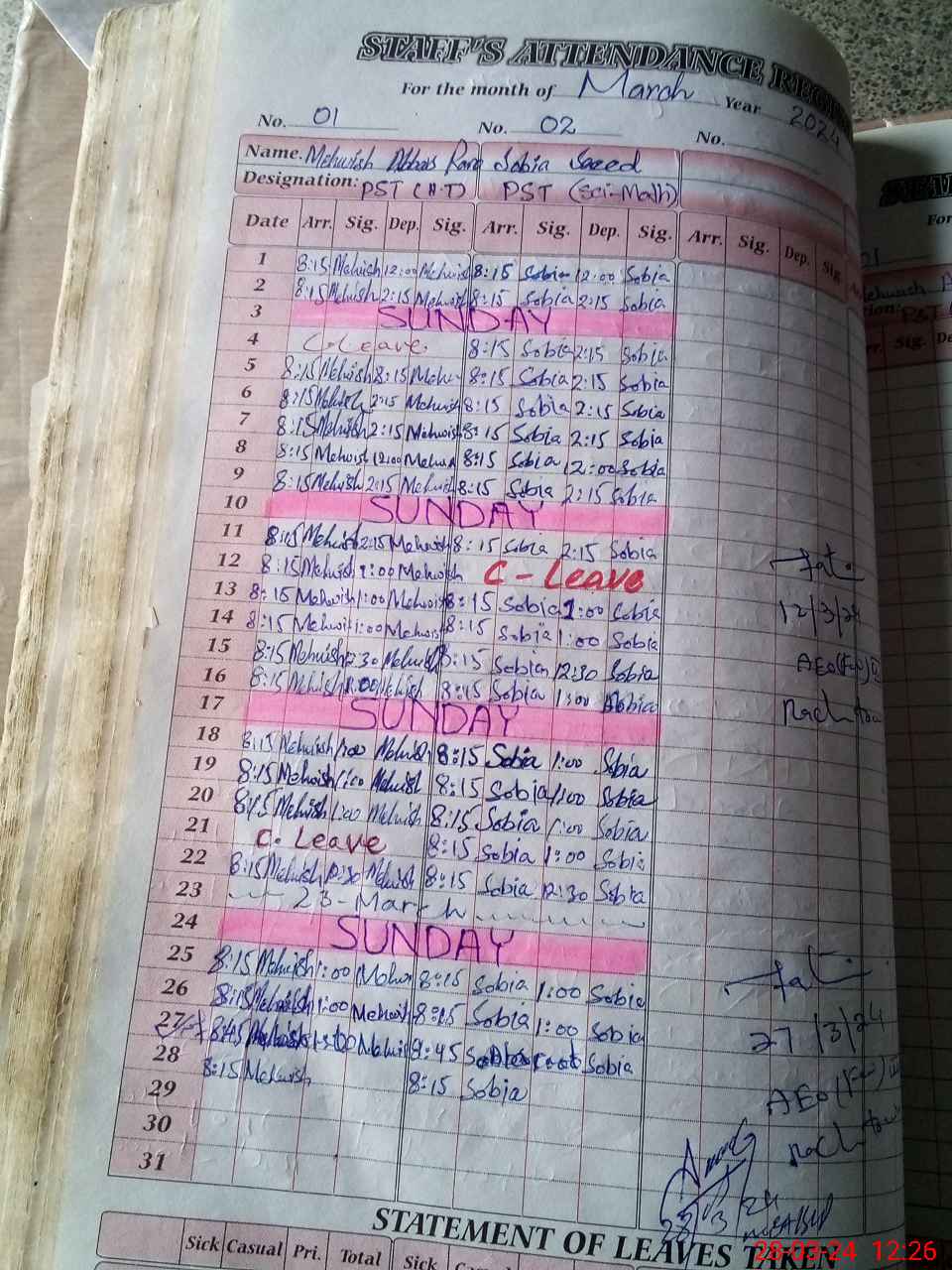| Leave | Duty | Absent | Maternity | Medical | Ex- Pak |