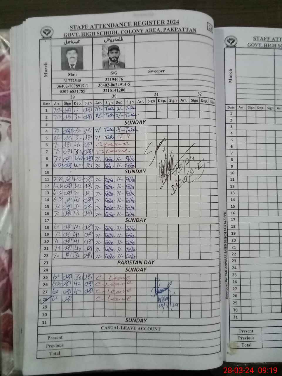 | Name: SA**** HU**** Designation: (School Headmaster's/Headmistress's) HEADMASTER Phone/Cell Number: 03**** |