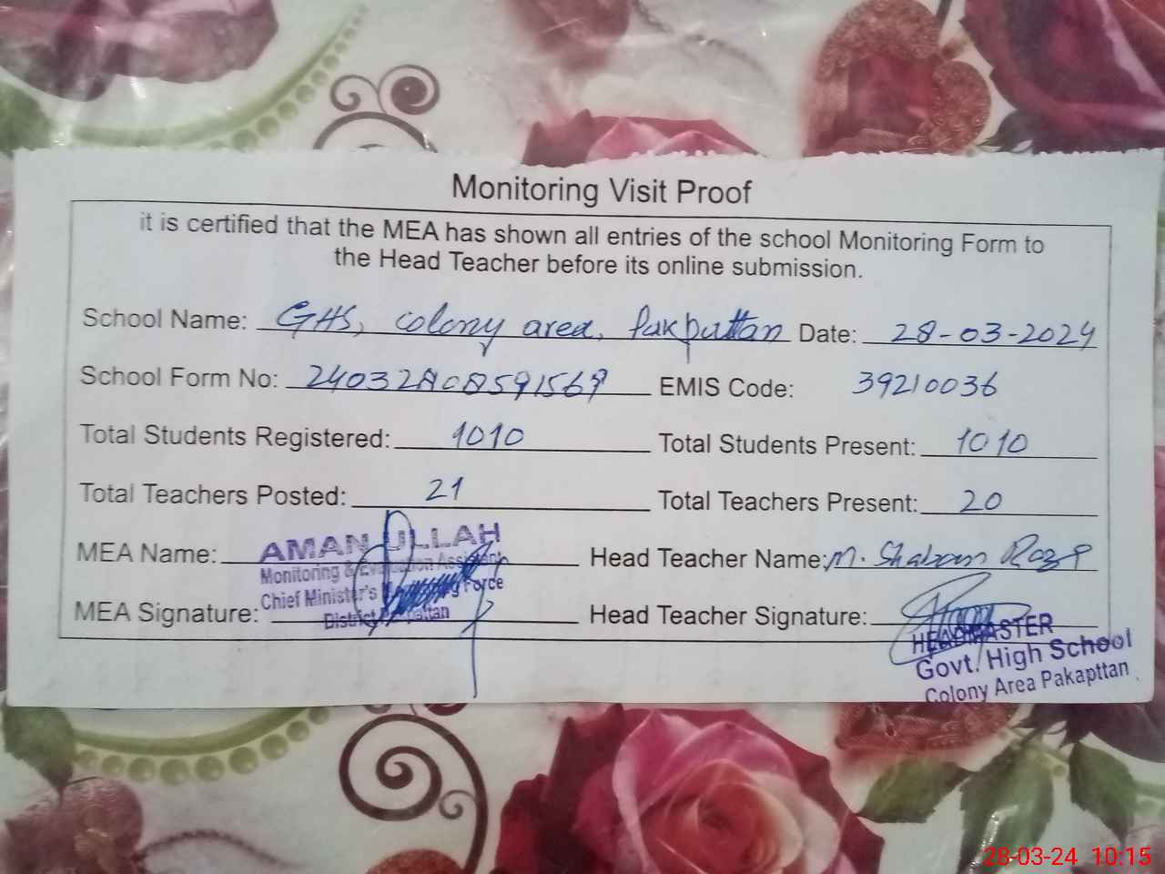 | EMIS Code: 39210036 | Name of School: GHS COLONY AREA PAKPATTAN | |||