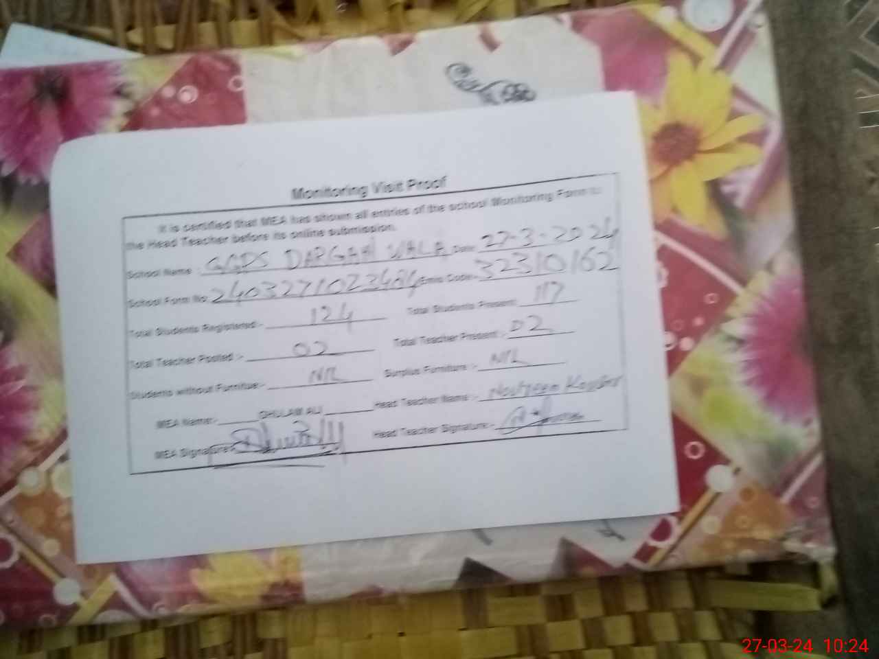 | Attendance Register | Head Teacher | MEA with School | Visit Proof |