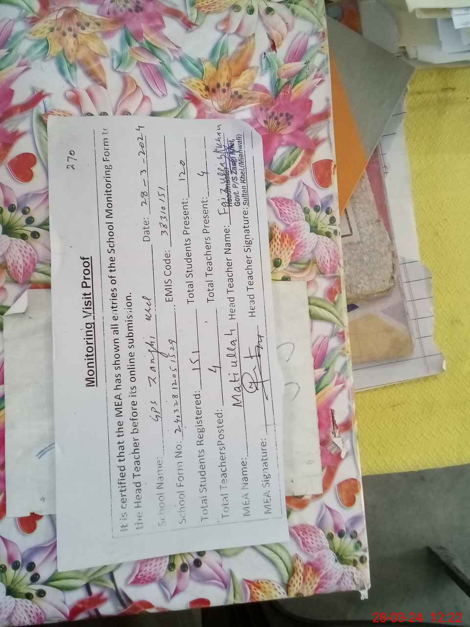 | Attendance Register | Head Teacher | MEA with School | Visit Proof |
