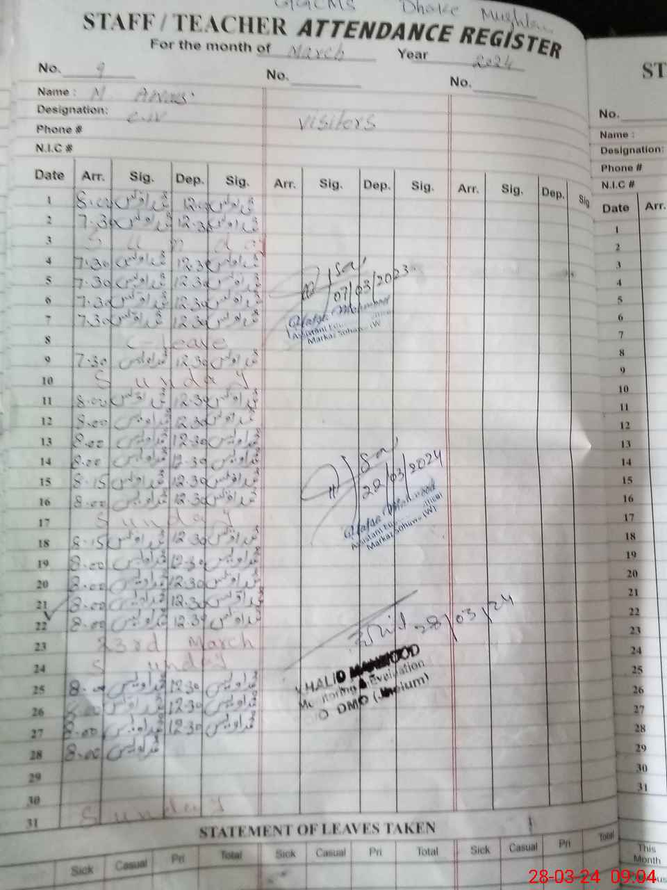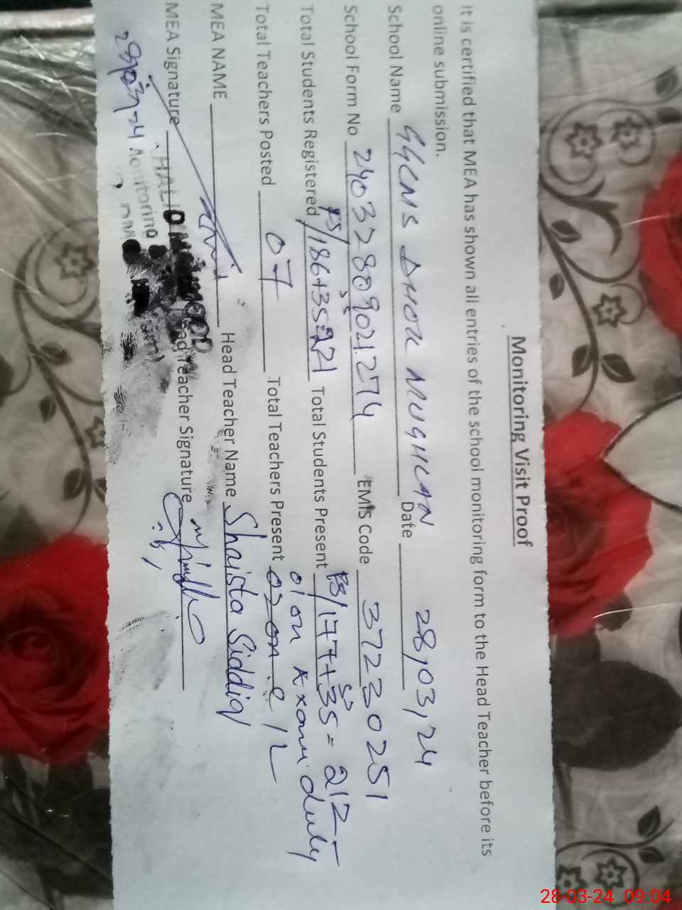 | Attendance Register | Head Teacher | MEA with School | Visit Proof |