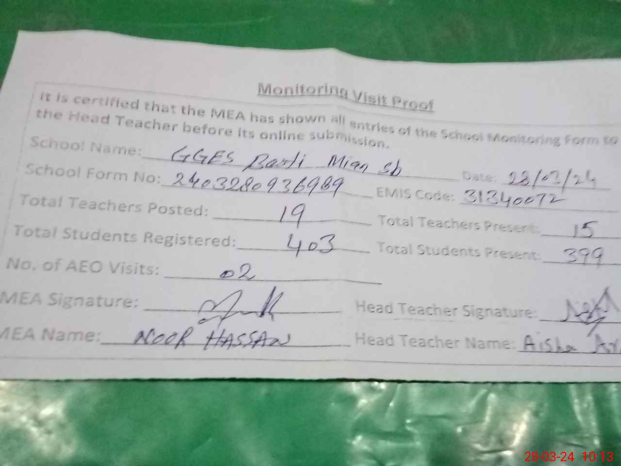 | Certified that this School was Inspected by the Undersigned MEA/DMO Today and the Information Stated Above is as Per Record. | |||||