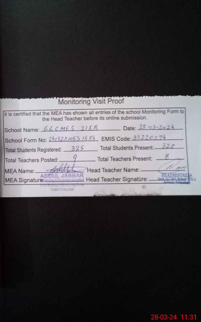 | Certified that this School was Inspected by the Undersigned MEA/DMO Today and the Information Stated Above is as Per Record. | |||||
