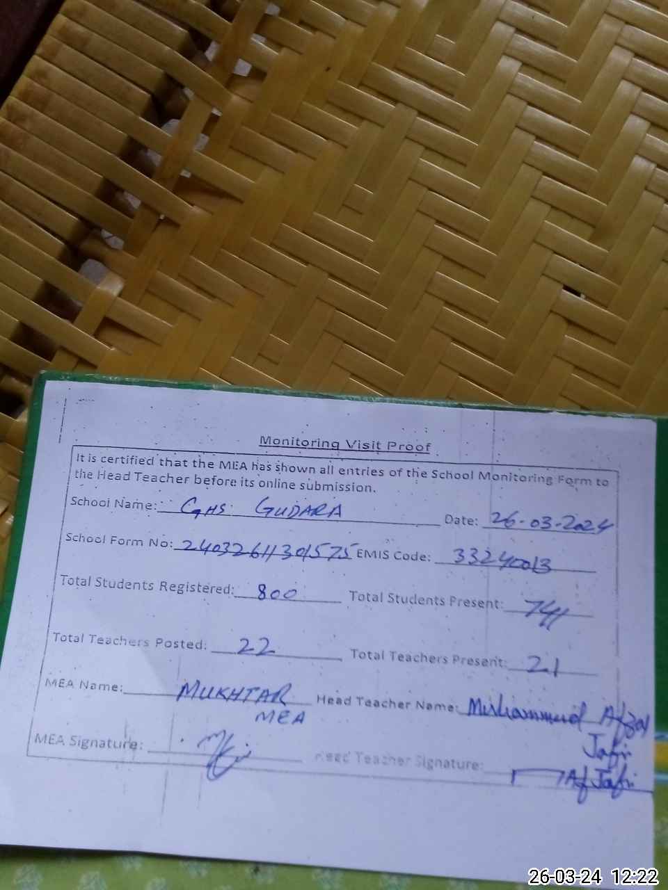 | Attendance Register | Head Teacher | MEA with School | Visit Proof |