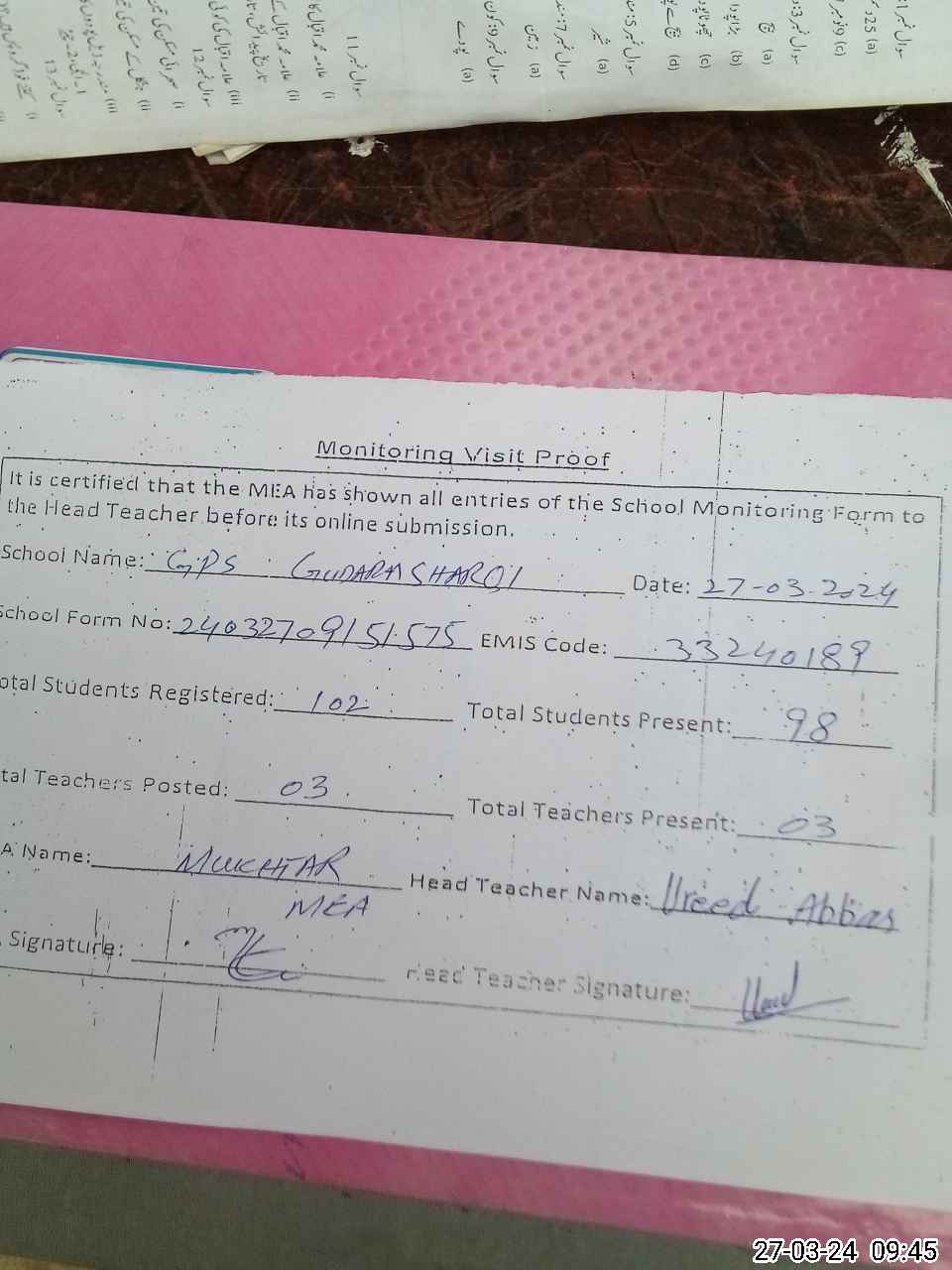 | EMIS Code: 33240189 | Name of School: GPS GUDARA SHARQI | |||