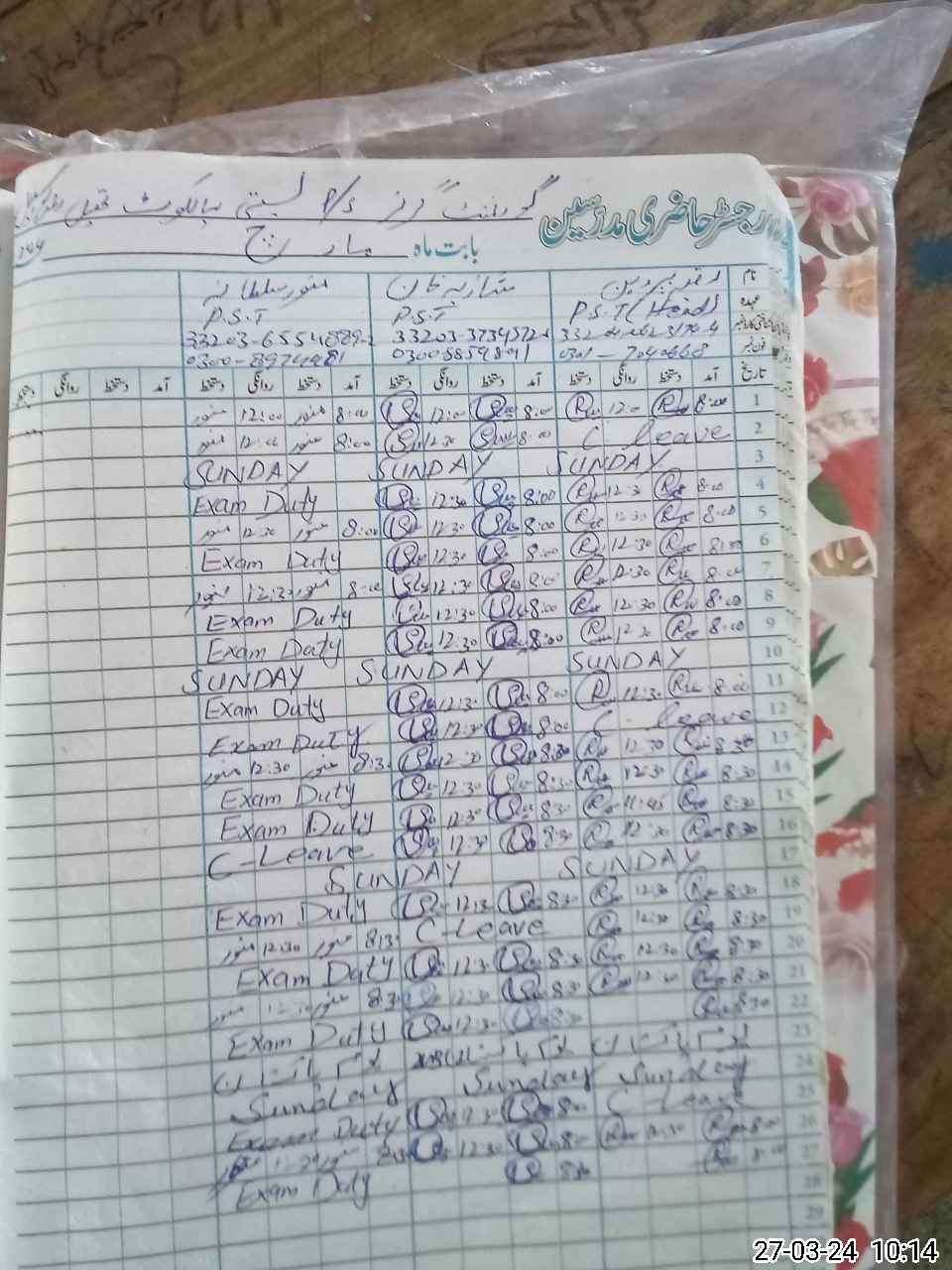 | 33**** | Mu**** Su**** | PST | Regular | 0 | 0 | 0 | 0 | 0 | 0 | 0 | 0 | 0 | Exam Duty |