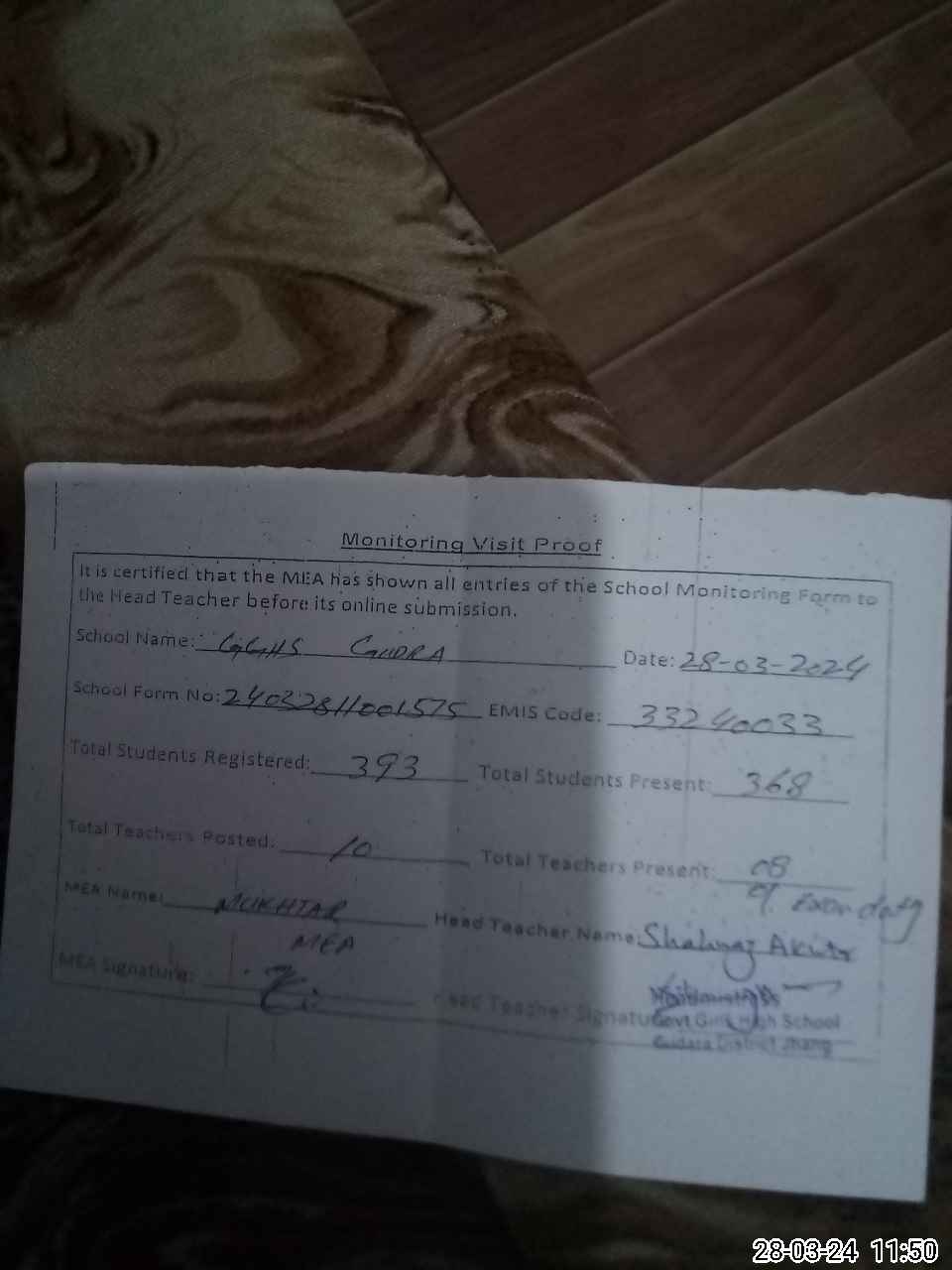 | Attendance Register | Head Teacher | MEA with School | Visit Proof |