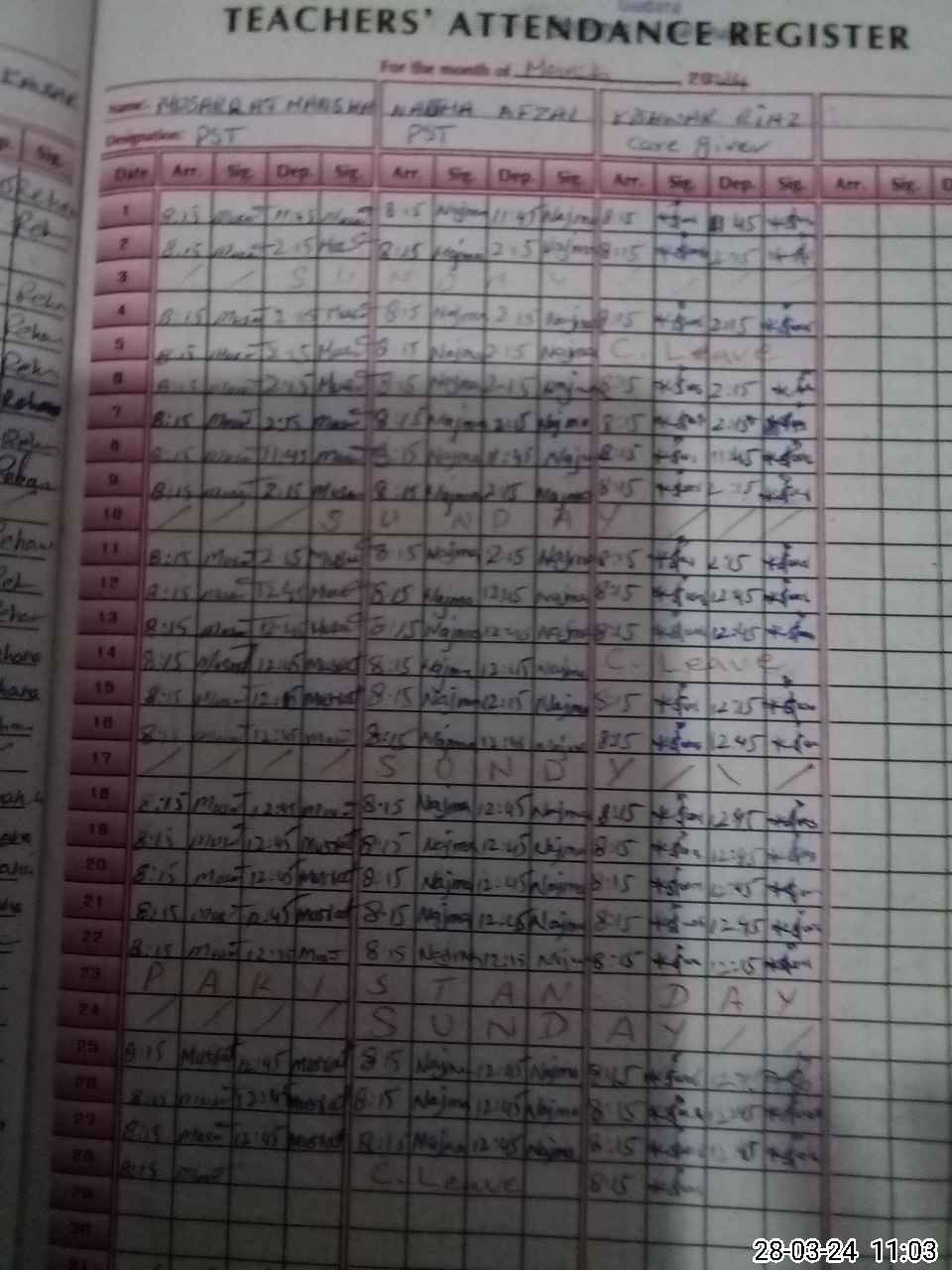 | CNIC | Full Name | Designation | R/C | Absence During Last Calender Month |