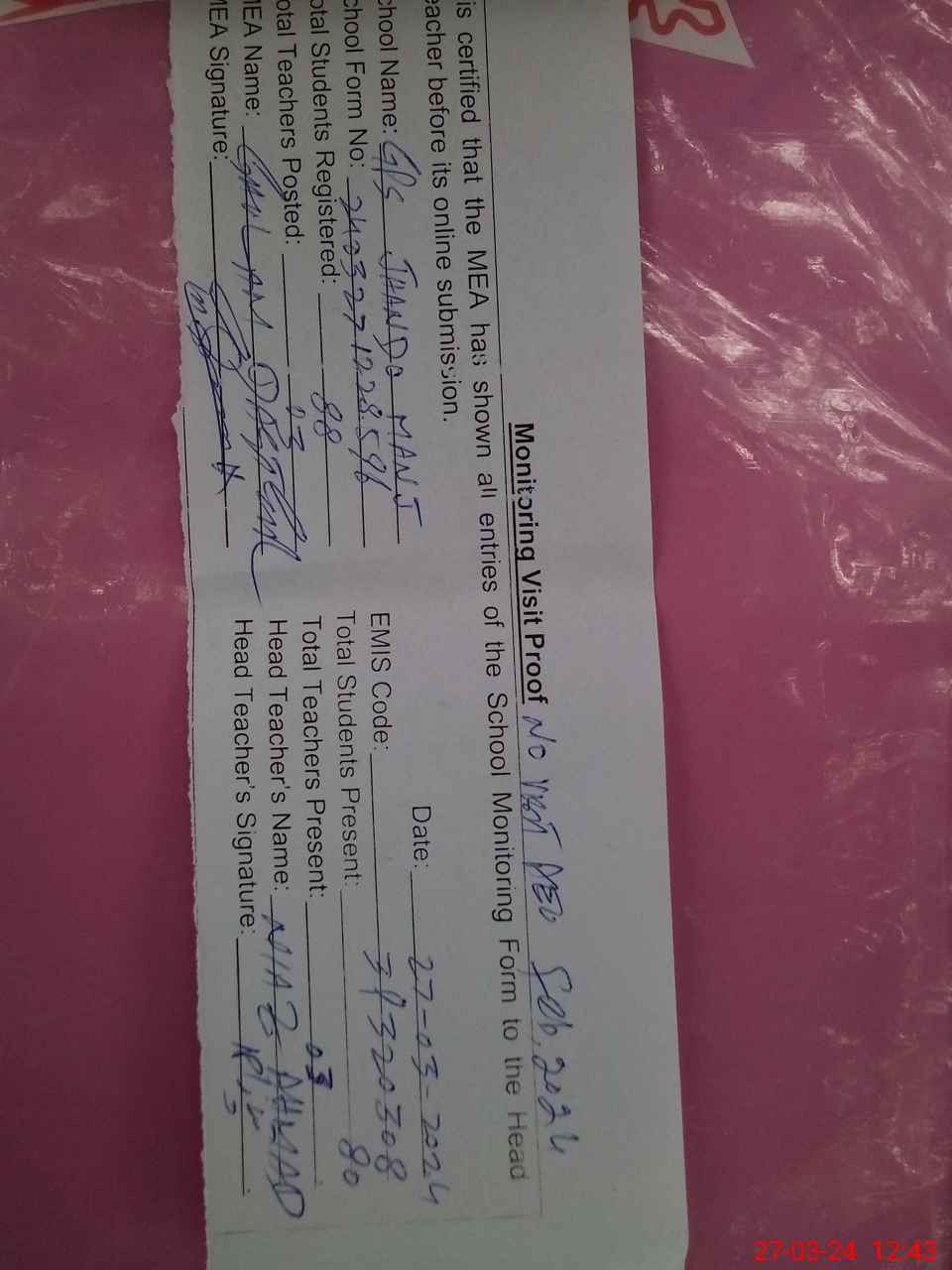 | Attendance Register | Head Teacher | MEA with School | Visit Proof |