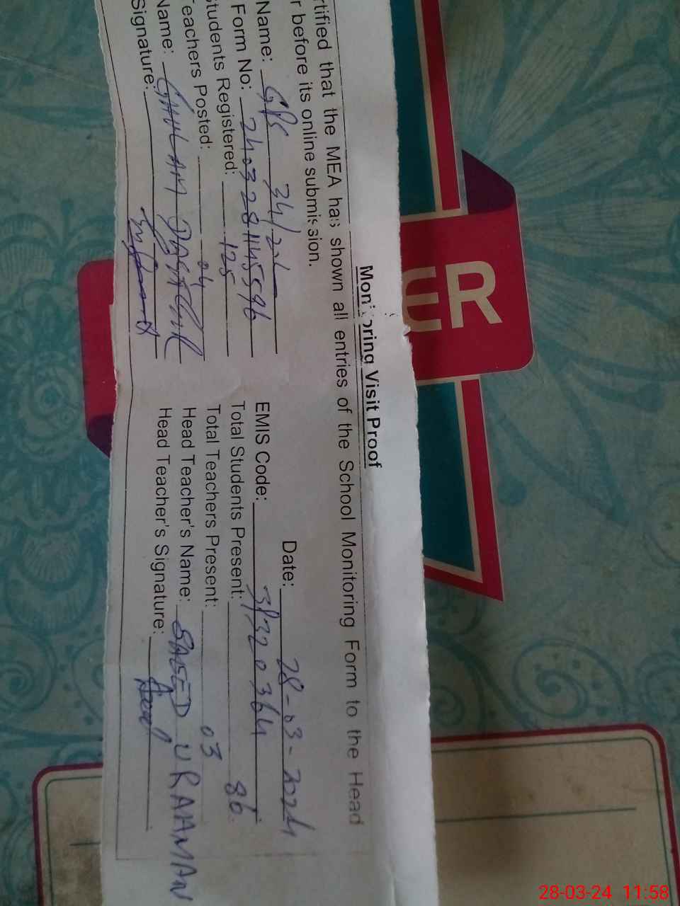 | Attendance Register | Head Teacher | MEA with School | Visit Proof |