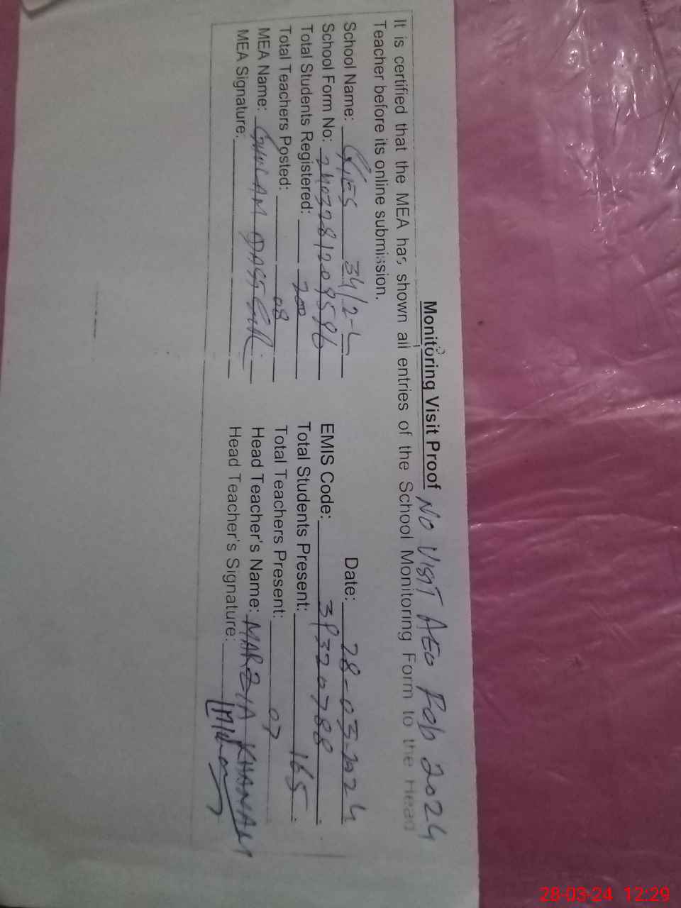 | Attendance Register | Head Teacher | MEA with School | Visit Proof |