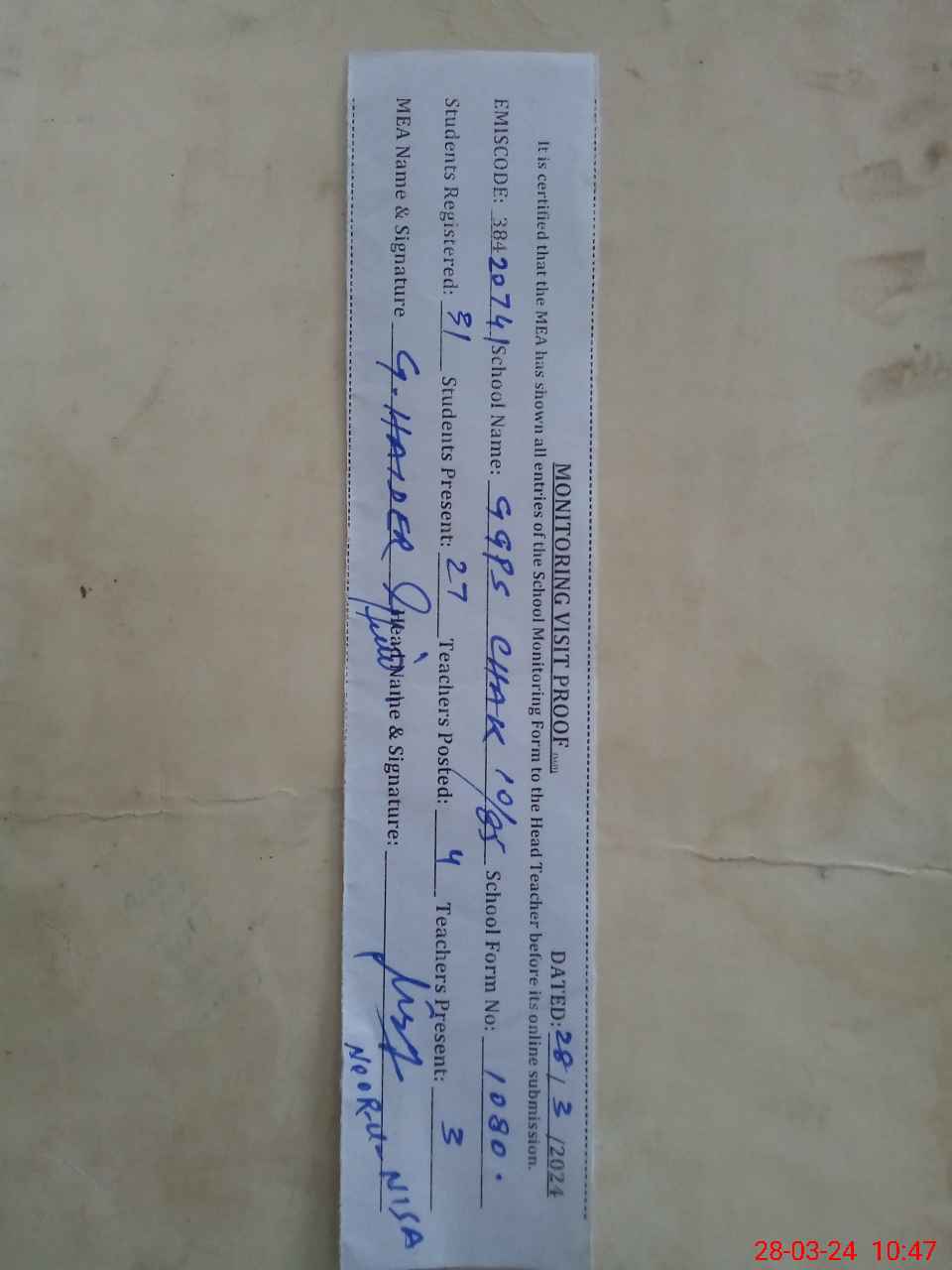 | Attendance Register | Head Teacher | MEA with School | Visit Proof |