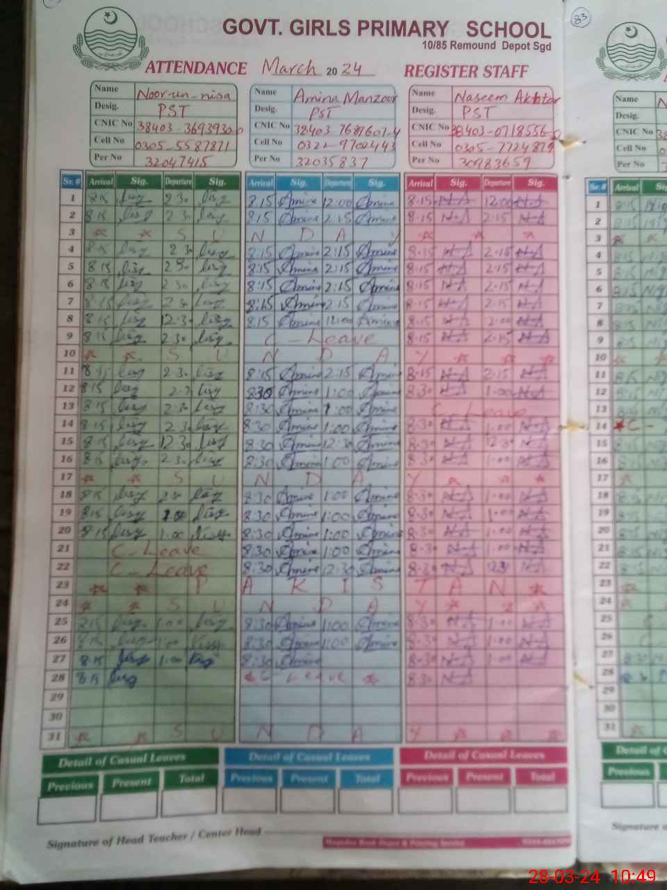 | CNIC | Full Name | Designation | R/C | Absence During Last Calender Month |