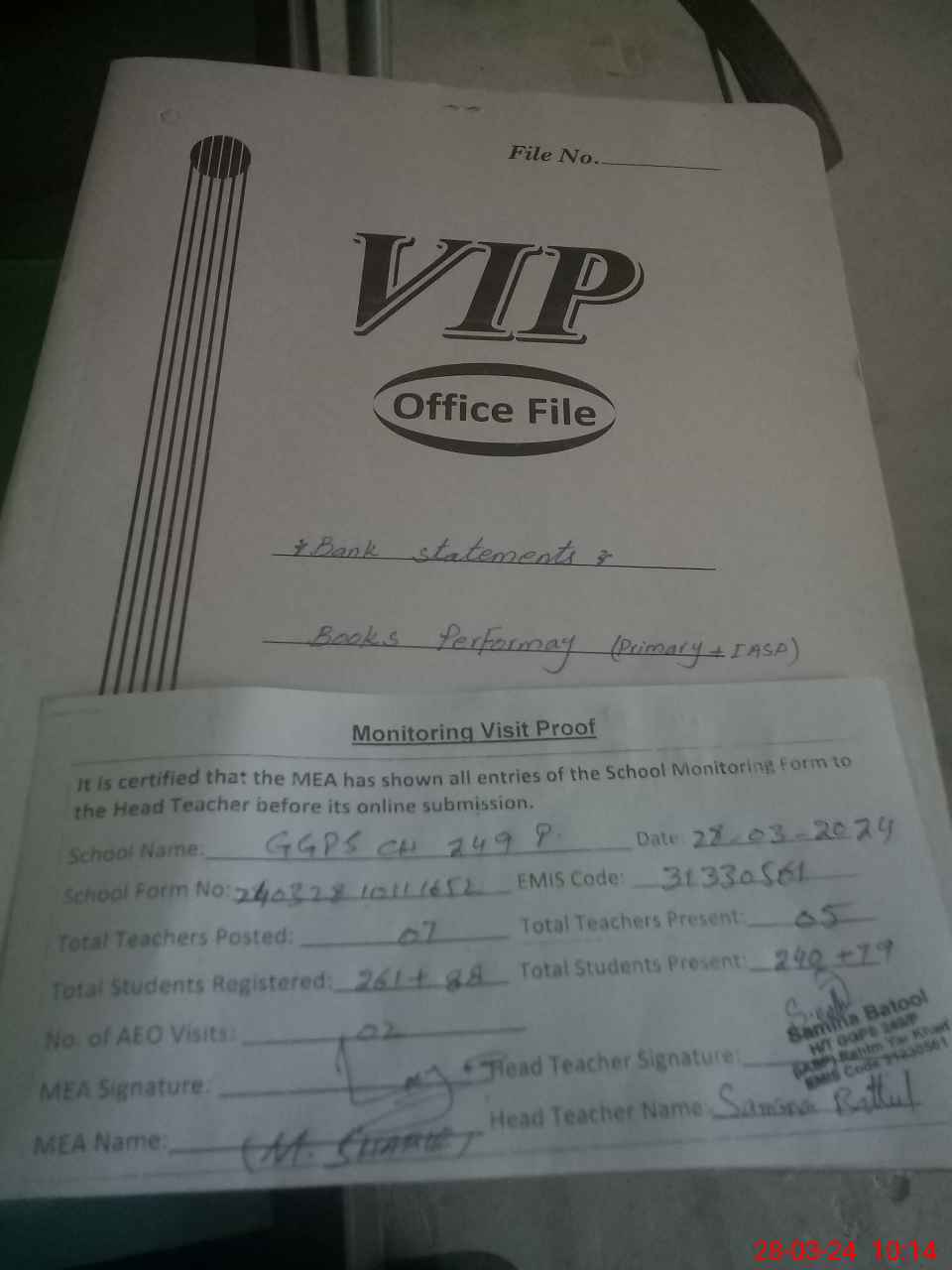 | Attendance Register | Head Teacher | MEA with School | Visit Proof |