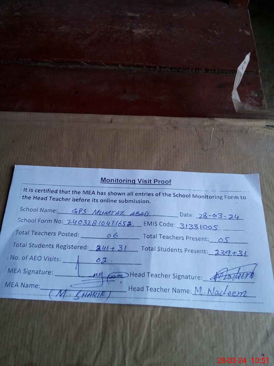 | Attendance Register | Head Teacher | MEA with School | Visit Proof |