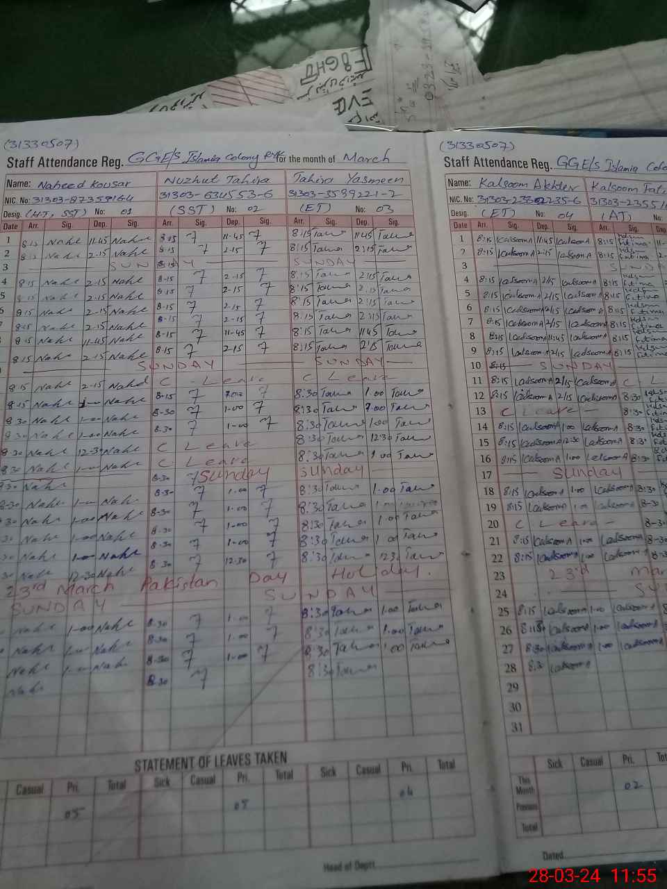 | CNIC | Full Name | Designation | R/C | Absence During Last Calender Month |