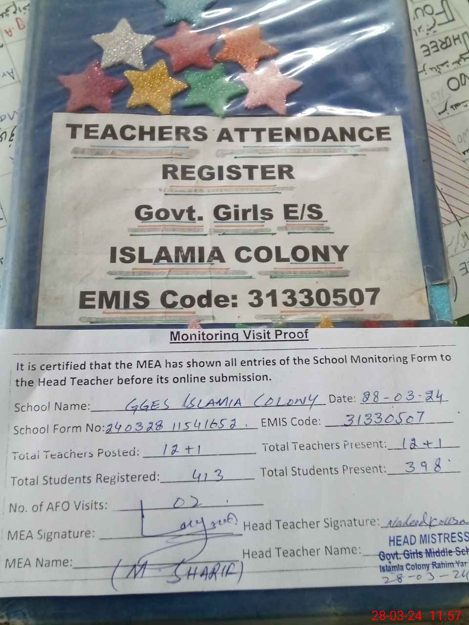 | Attendance Register | Head Teacher | MEA with School | Visit Proof |