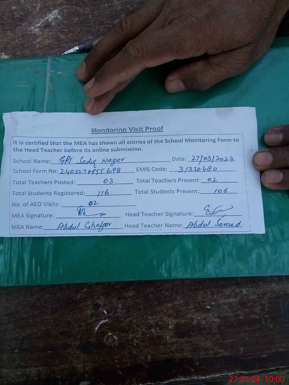 | Name: AB**** SA**** Designation: (School Headmaster's/Headmistress's) PST/PTC/JV Phone/Cell Number: 03**** |