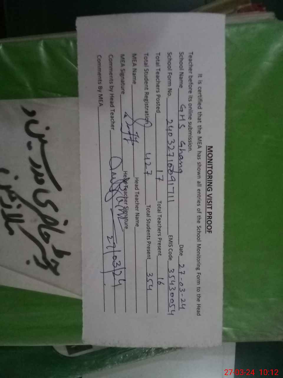 | Attendance Register | Head Teacher | MEA with School | Visit Proof |