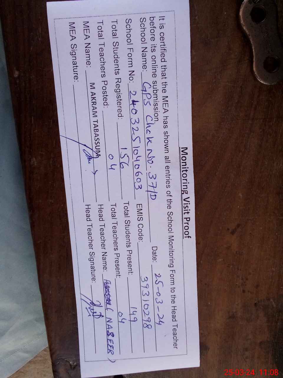 | Attendance Register | Head Teacher | MEA with School | Visit Proof |