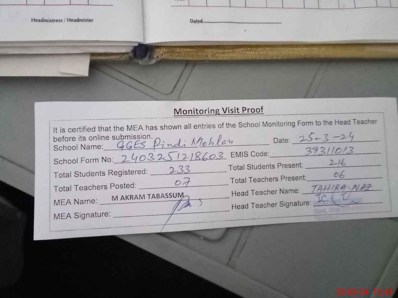 | EMIS Code: 39311013 | Name of School: GGES CHAK PINDI MOHLAN | |||