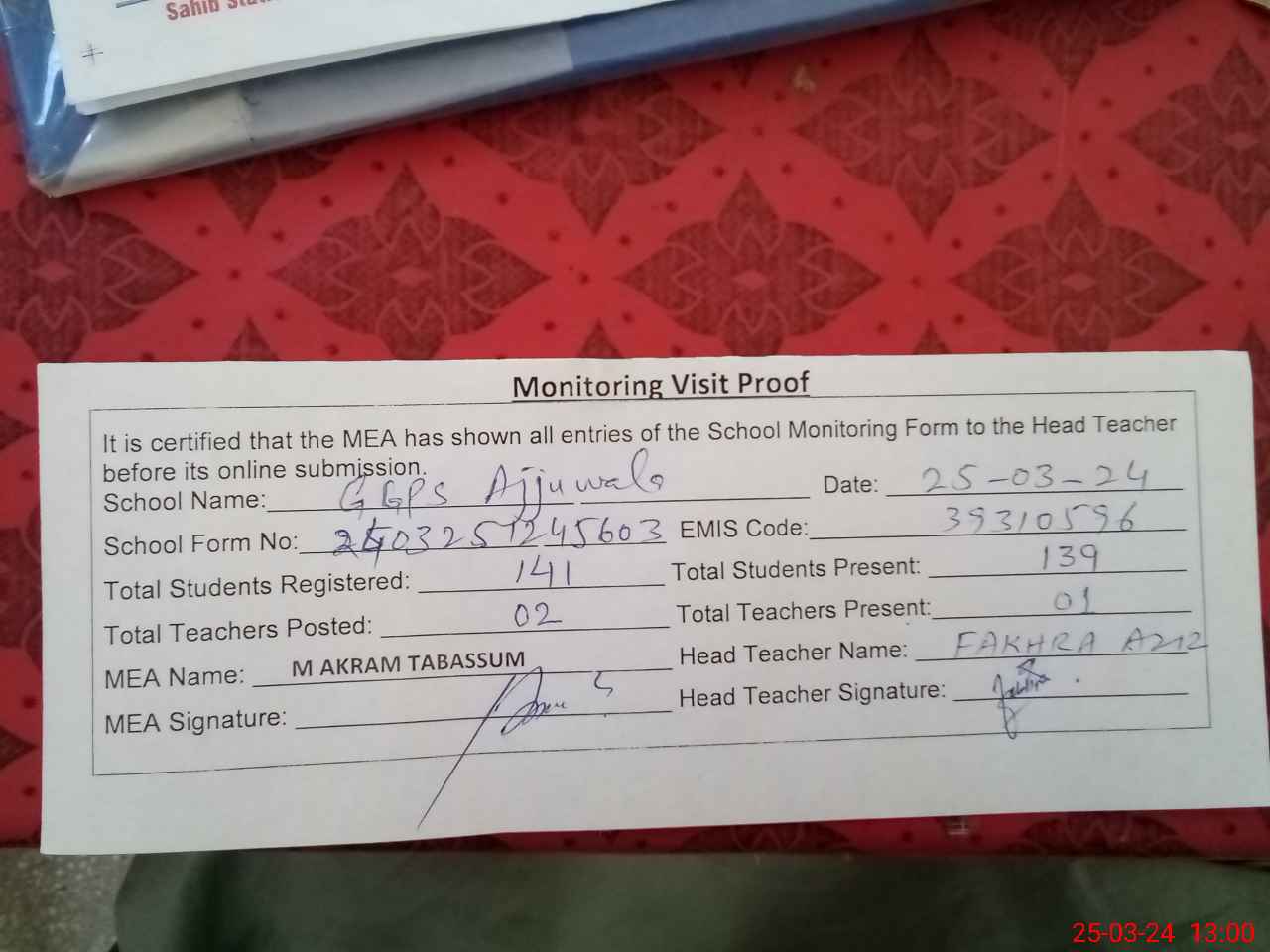 | Attendance Register | Head Teacher | MEA with School | Visit Proof |