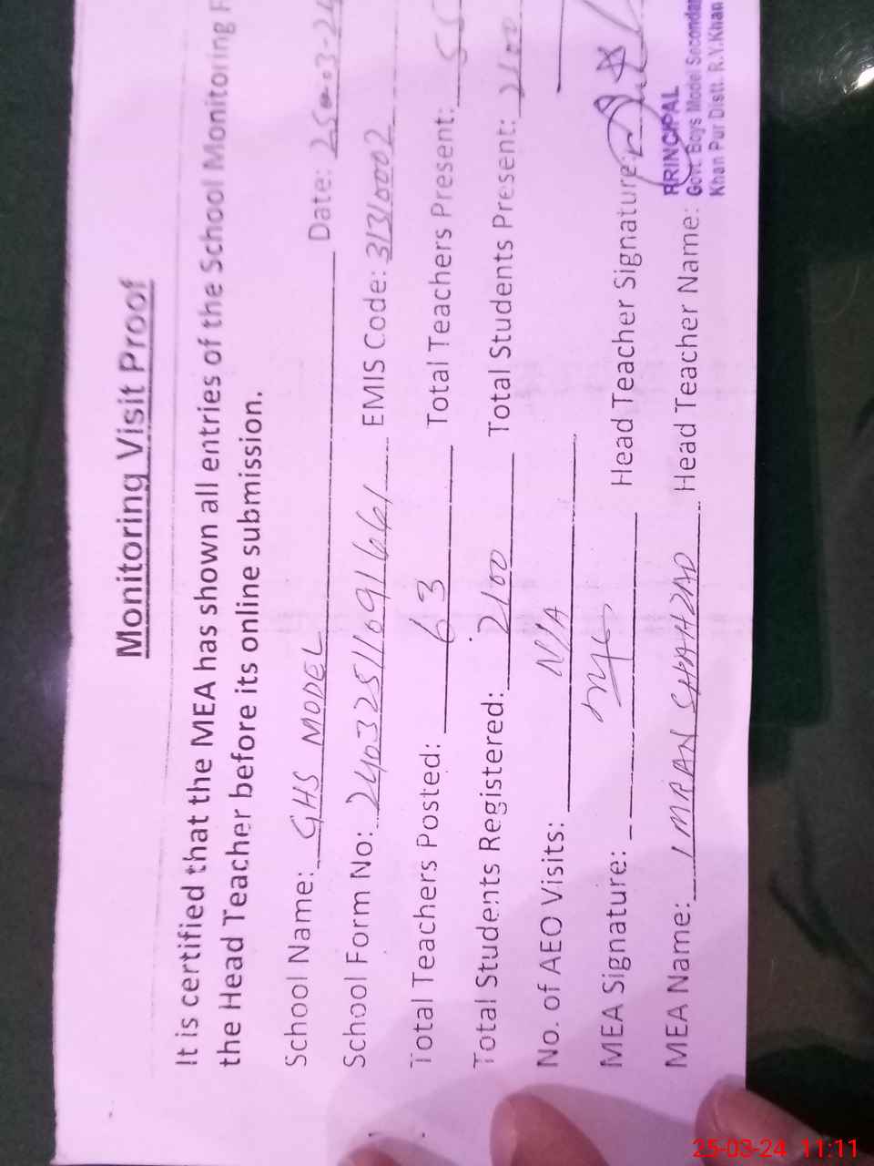 | Certified that this School was Inspected by the Undersigned MEA/DMO Today and the Information Stated Above is as Per Record. | |||||