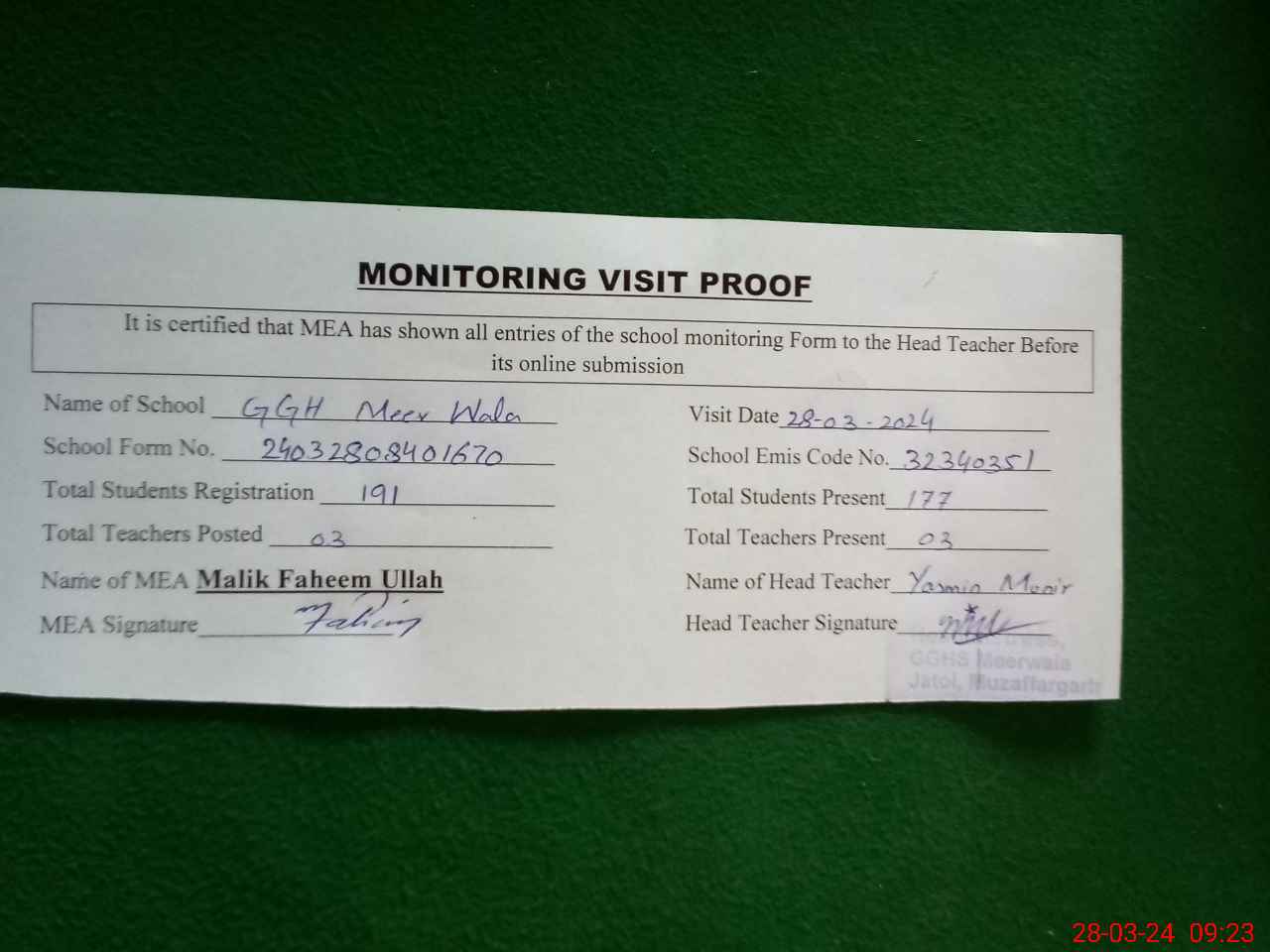 | EMIS Code: 32340351 | Name of School: GGHS MEER WALA | |||