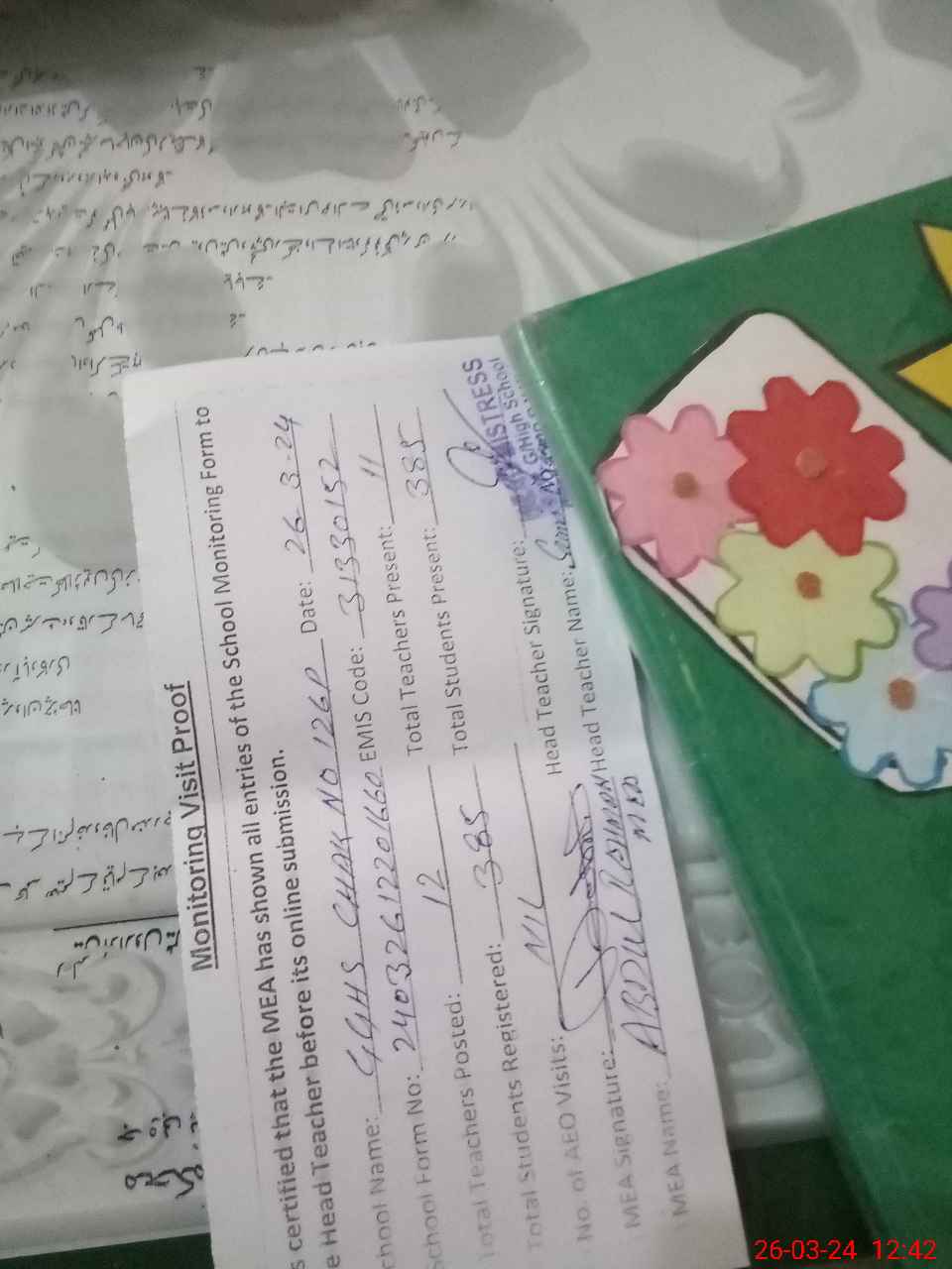 | Attendance Register | Head Teacher | MEA with School | Visit Proof |