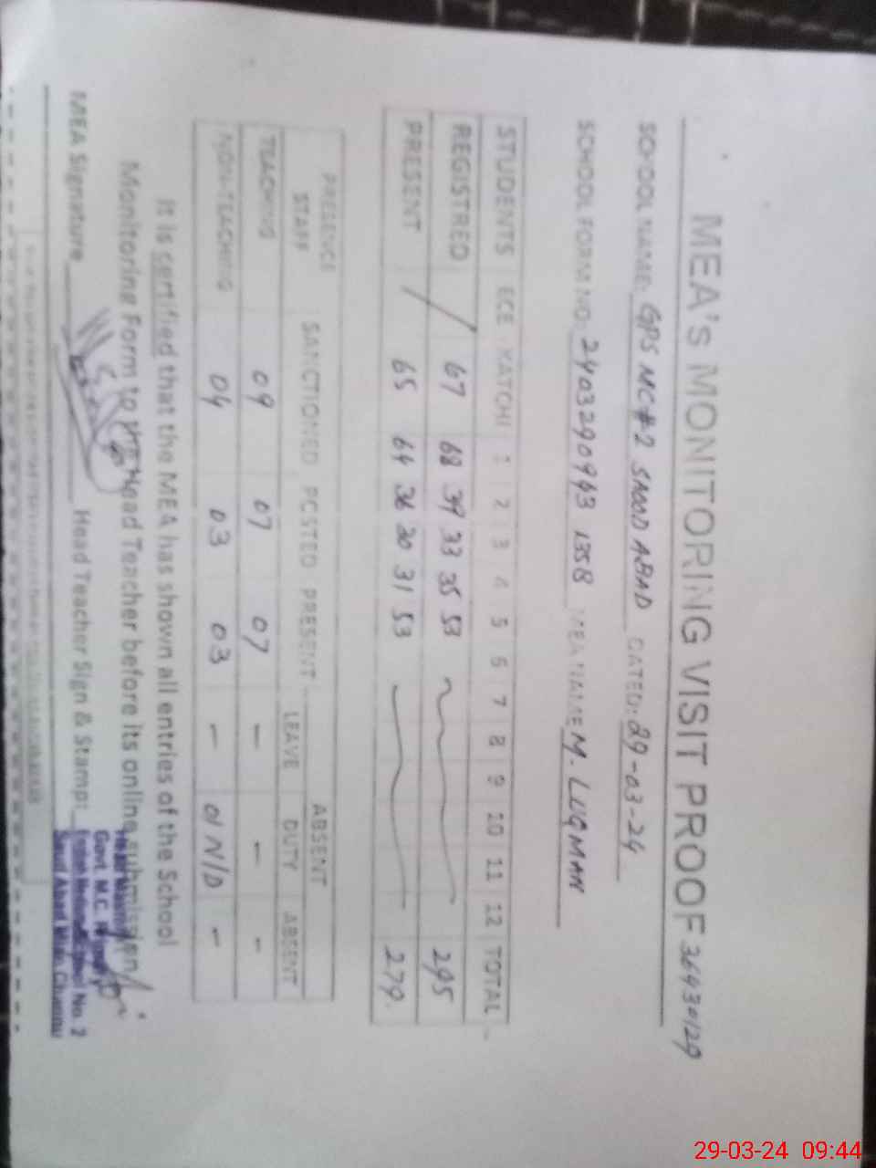 | Attendance Register | Head Teacher | MEA with School | Visit Proof |