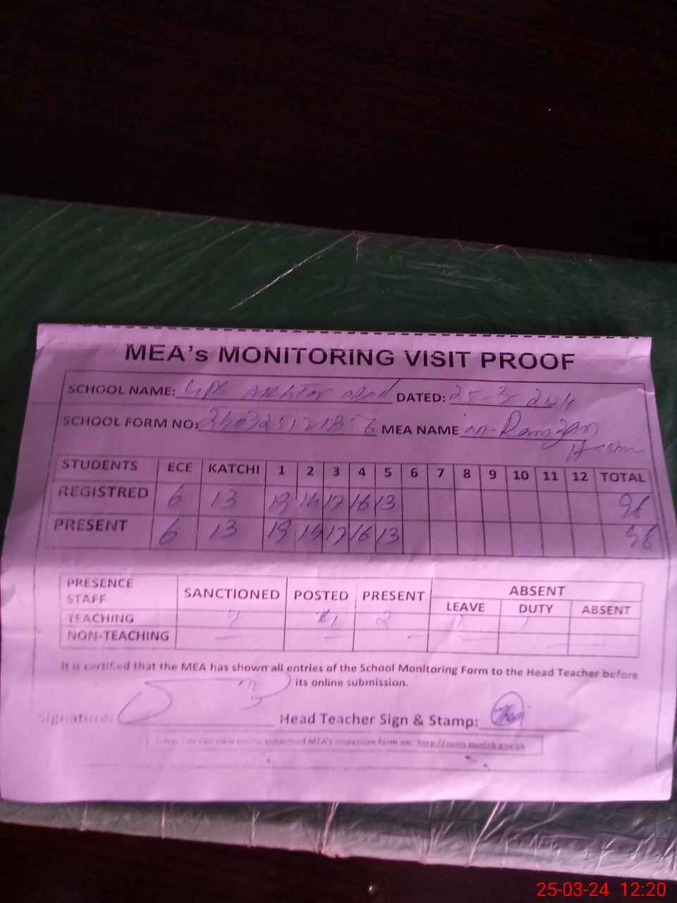 | Attendance Register | Head Teacher | MEA with School | Visit Proof |